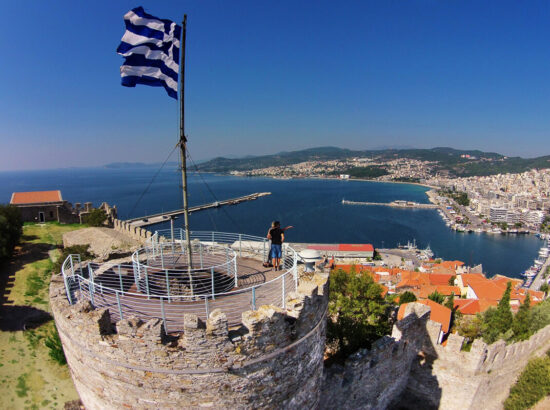 The peak of the peninsula of Panagia is dominated by the Acropolis of Kavala, the largest part of which was built in the first quarter of the 15th century AD. It succeeded the Byzantine Acropolis of Christoupolis (an older name for Kavala), which had been destroyed in 1391, the ruins of which were incorporated into its construction. The purpose of the fortress was to control and protect the critical route of the Via Egnatia. The fortress was built on a position with excellent natural defenses and in a period when wars were fought with weapons of “cold steel” and not with missile weapons of mass destruction. The Acropolis was used for the last time during the Second World War by the occupying forces. The successive repairs and intervention to its fortifications, from the Byzantines to the Venetians and the Ottomans, The entire acropolis has been built using unworked local granite blocks, mixed in with pieces of brick and marble. Entering through its central entrance, we can see that it is divided into an inner and an outer precinct by a transverse wall. The inner precinct was the most important part of the acropolis as it contained all the essential areas for its defense. Today, the visitor can see: The central circular tower, which was the last line of defense The gunpowder and food store, which was later converted into a jail The garrison, a space suitable for the quarters of the officers or guards The water cistern Two square and one polygonal tower can be seen in the walls of the outer precinct of the acropolis, while in its inner precinct there is an open-air theater for cultural events and a cafe for visitors.